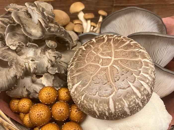 Shiitake, Blue oyster, Lion's mane, chestnut, pioppino, and maitake mushrooms.